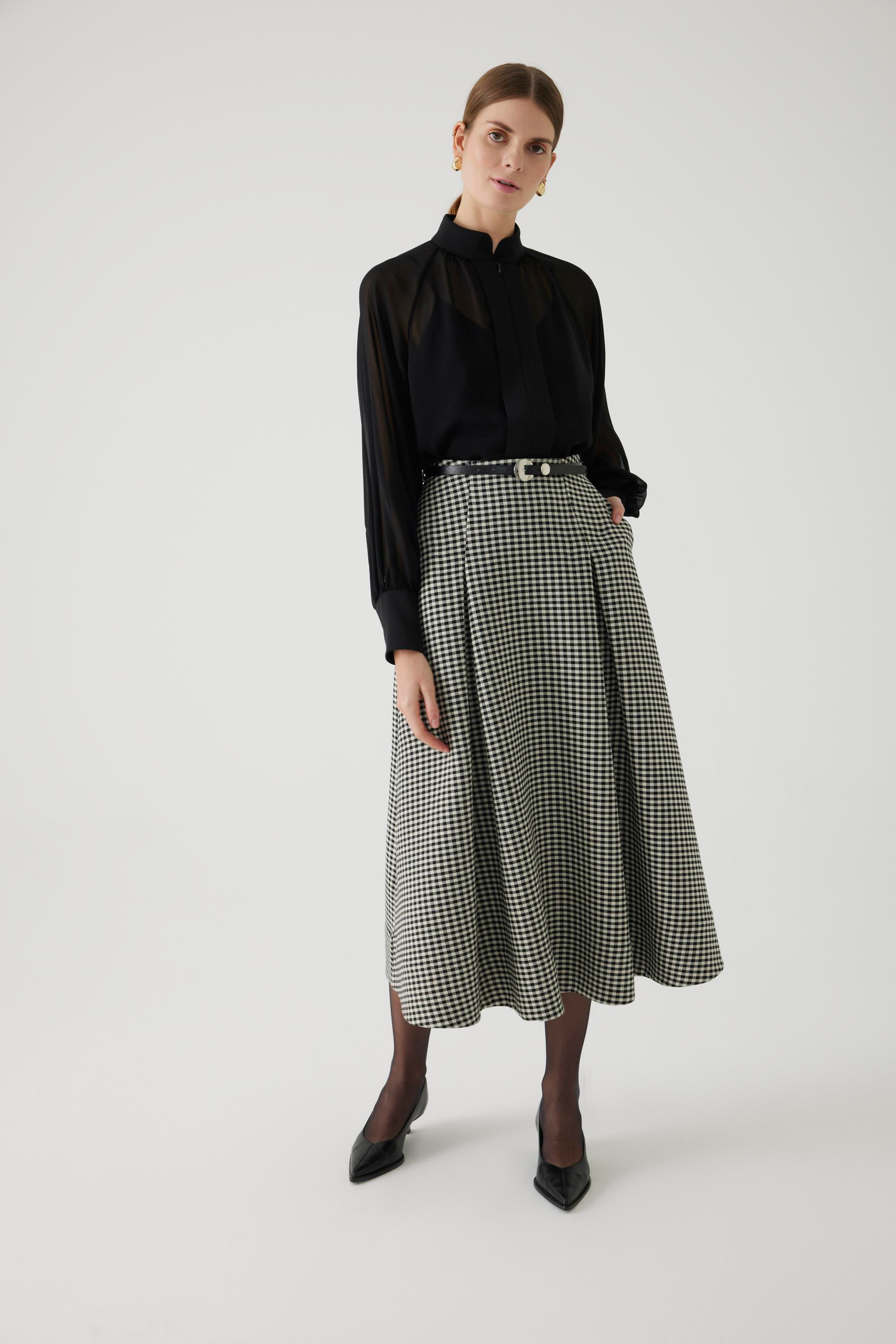A kesim ve pötikare desenli tasarımıyla bu midi etek, zarif ve klasik bir görünüm sunar. Kemer detayı ve regular kesimiyle hem konforlu hem de şık bir seçenek olarak 24 Fall/Winter koleksiyonunun öne çıkan parçalarındandır. Tarzınıza sofistike bir dokunuş katın.