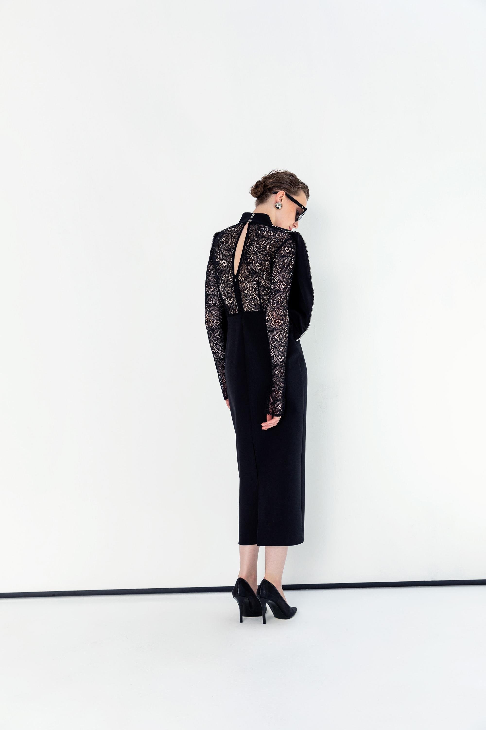 Kameya- Sırtı ve Kolu Dantelli Boncuk Detaylı Elbise (25W40647)